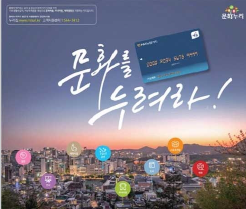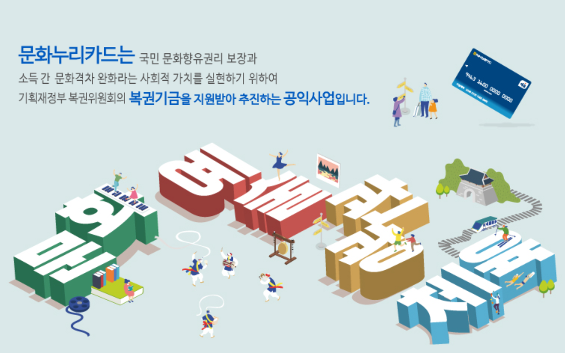 문화누리카드는 소득으로 인한 문화적 격차를 완화하고 삶의 질을 향상시키기 위해 지원하는 것으로 복권기금을 지원받아 추진되는 공익 사업입니다.