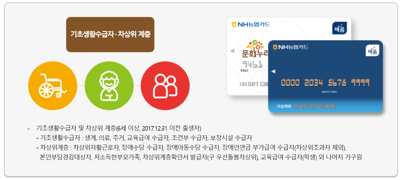 문화누리카드는 기초생활수급자와 차상위계층을 대상으로 합니다. 그리고 만 6세 이상이어야 신청할 수 있습니다.