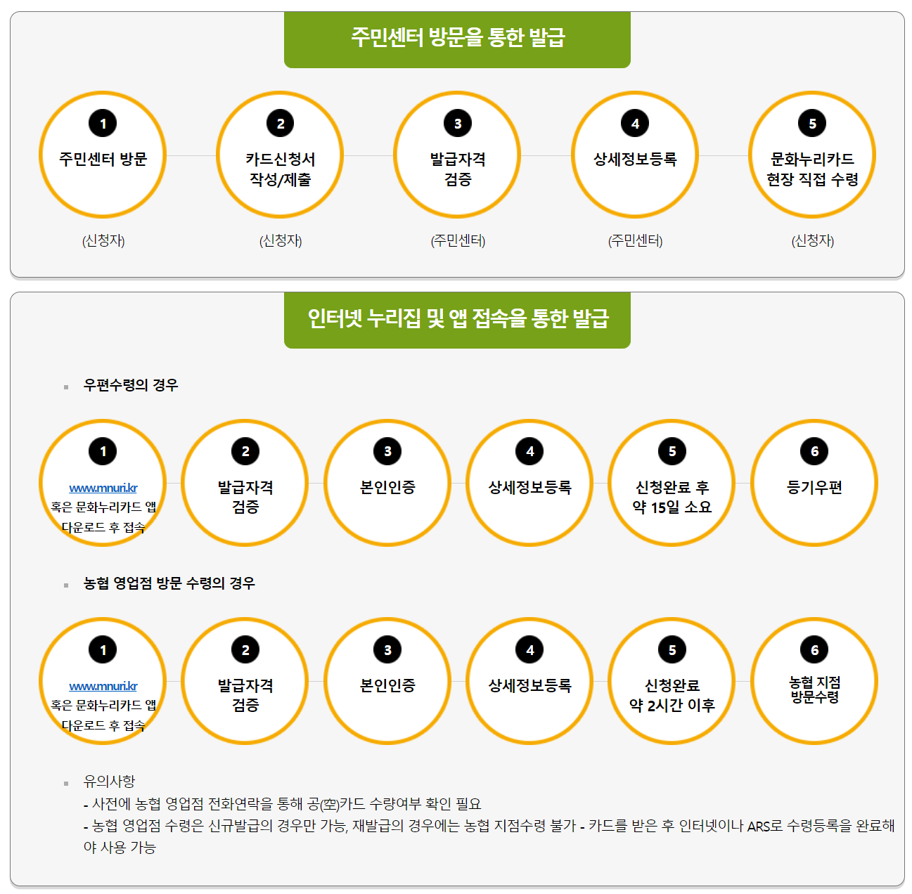 문화누리카드의 신청은 주민센터를 직접 방문하여 신청하는 방법과, 문화누리카드 앱이나 홈페이지를 통해 신청하는 방법이 있습니다.