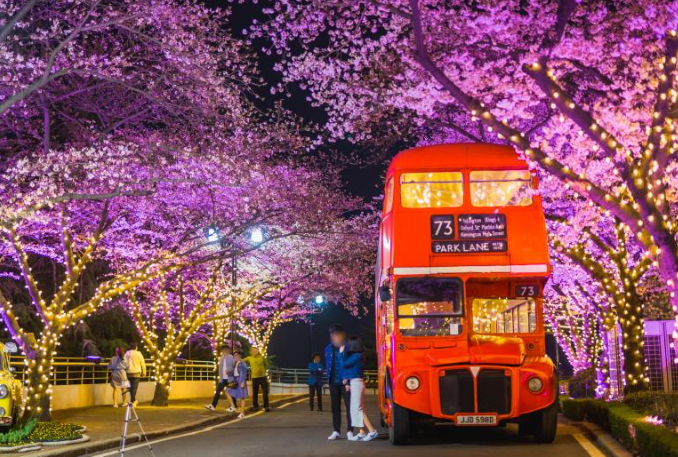 이월드 내의 벚꽃 티워 로드와 빨간 2층버스, 벚꽃 회전목마와 레인보우 블라썸 라이팅 등 낮과 밤을 가리지 않고 누구에게나 인생샷을 건질 기회를 제공해 줍니다.