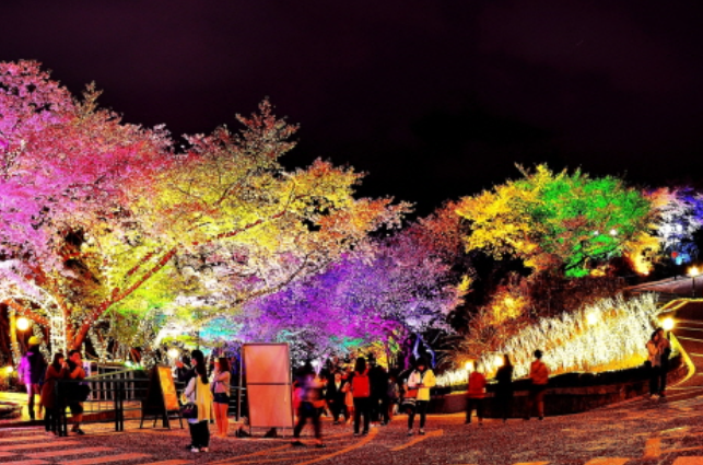 야간에도 멋진 조명과 함께 벚꽃을 감상할 수 있고 대규모 불꽃쇼와 전통놀이 등 다양한 체험 행사도 진행됩니다.