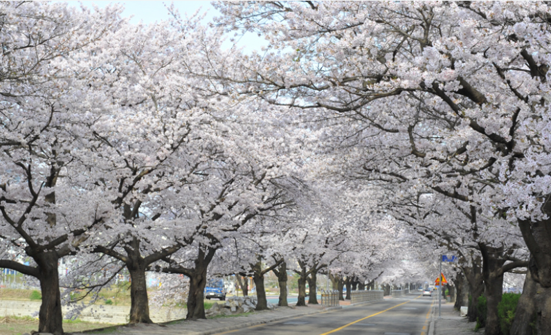 정읍천변의 5km 구간을 수놓은 1200여 그루의 왕벚나무에 풍성하게 만개하는 벚꽃이 화려한 튤립과 노랗게 물들이는 개나리 등과 함께 어우져 한 폭의 수채화 같은 풍경을 만들어 줍니다.